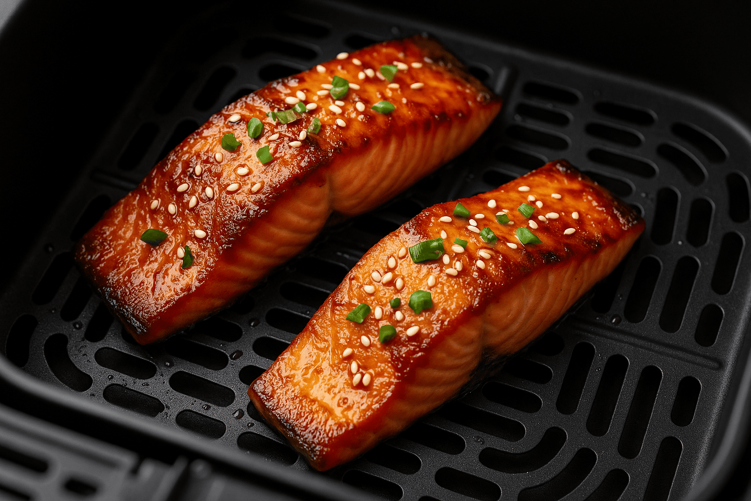 - Air fry for 8–10 minutes until the top is caramelized and the salmon is cooked through.
