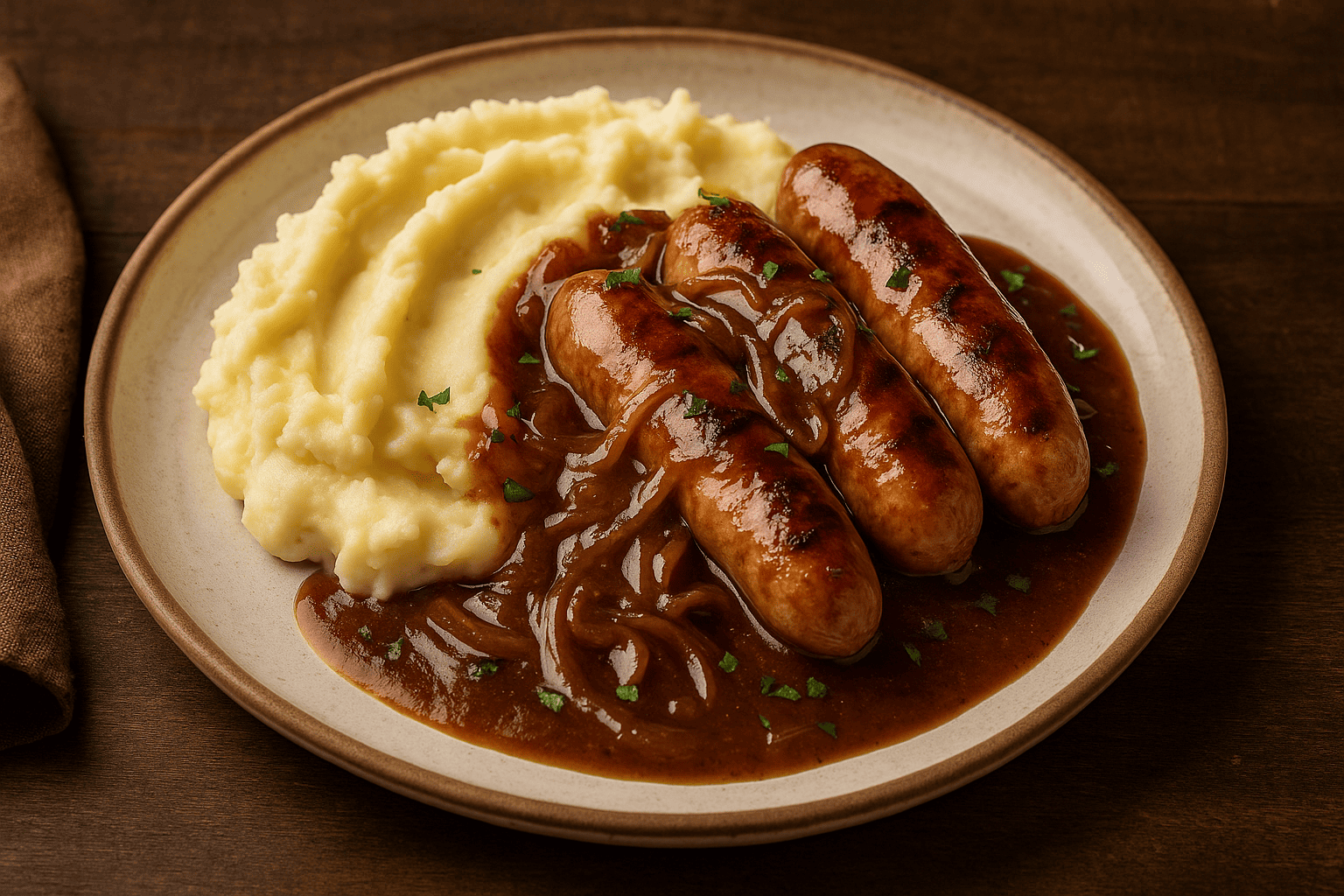 Bangers and Mash is a comfort food classic that’s found its home in Aussie kitchens and pubs alike. Juicy pan-fried sausages served over creamy mashed potatoes and topped with rich caramelised onion gravy — it’s the kind of hearty meal that warms you from the inside out.