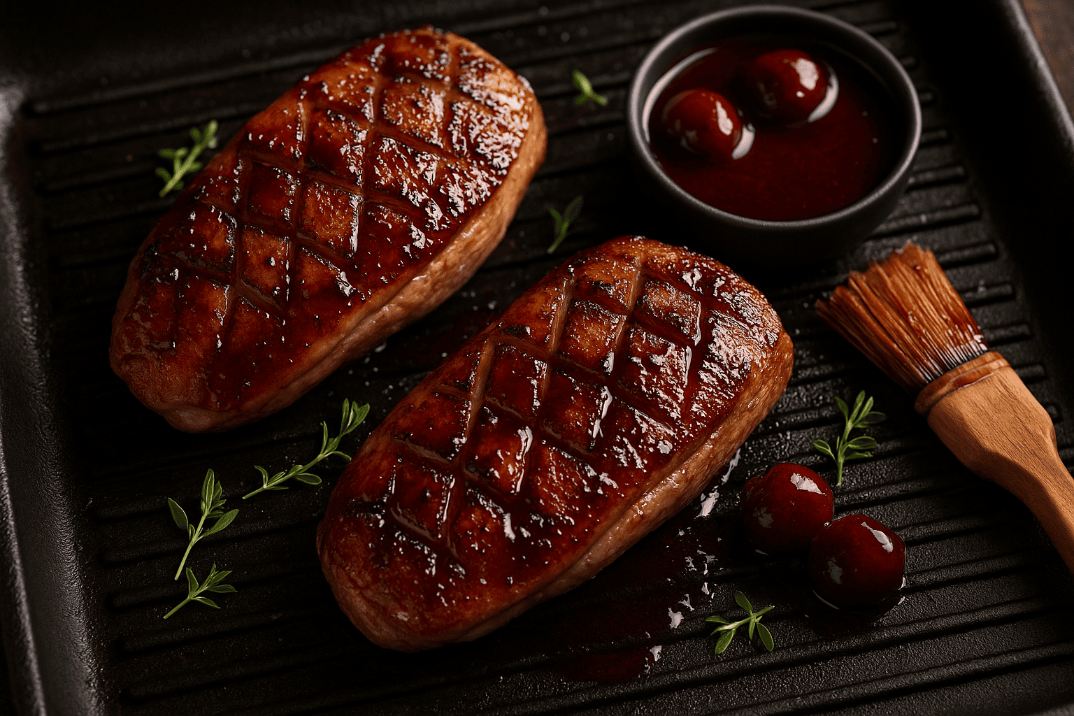 Crispy-skinned grilled duck breasts glazed in a rich cherry-balsamic reduction — a luxurious BBQ twist perfect for special occasions.