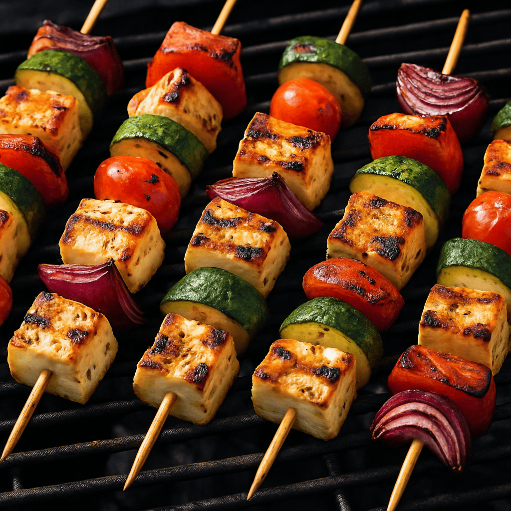 - Grill skewers for 8–10 minutes, turning occasionally, until halloumi is golden and veggies are slightly charred.