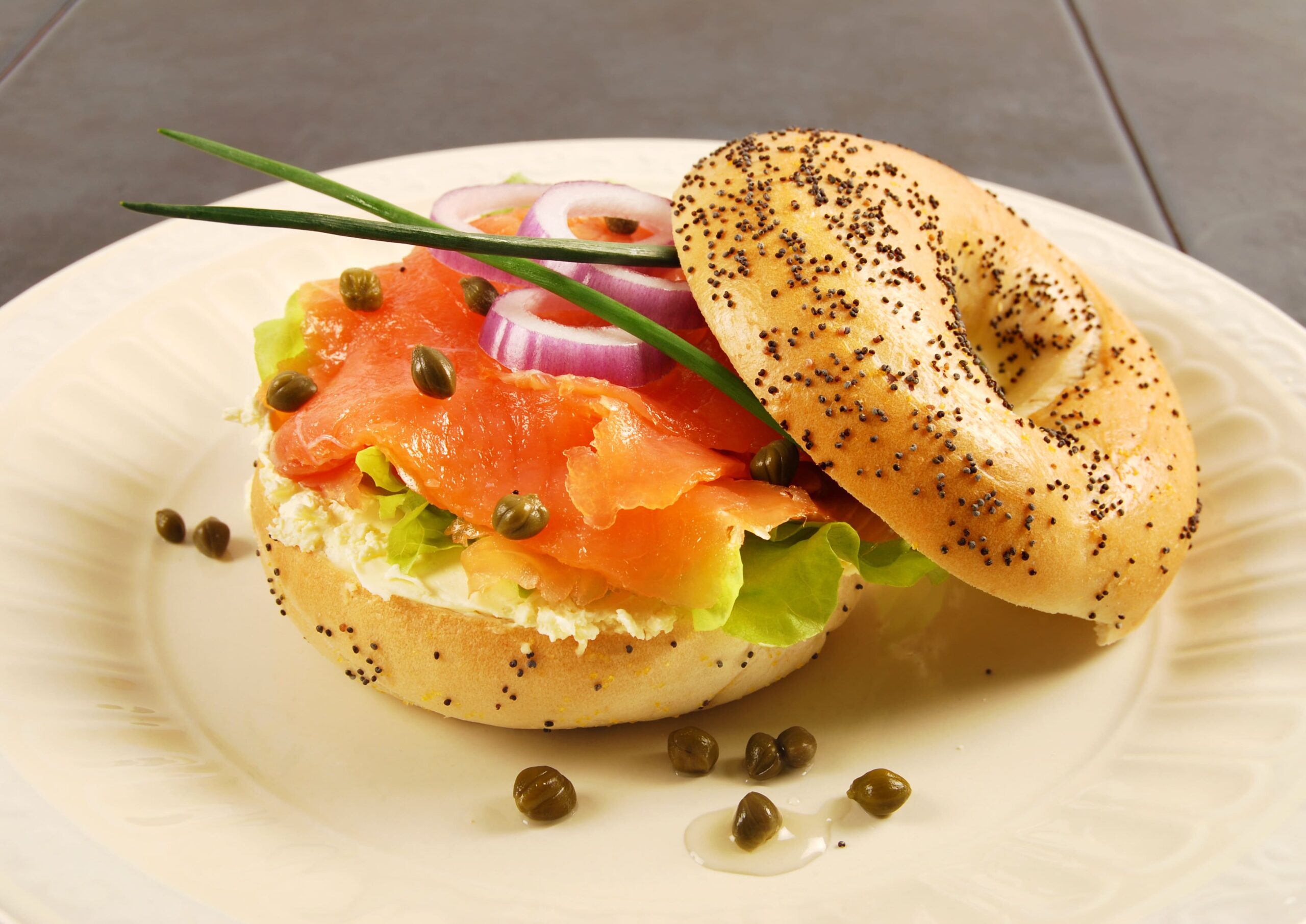 - Layer smoked salmon, onion rings, cucumber/capers.