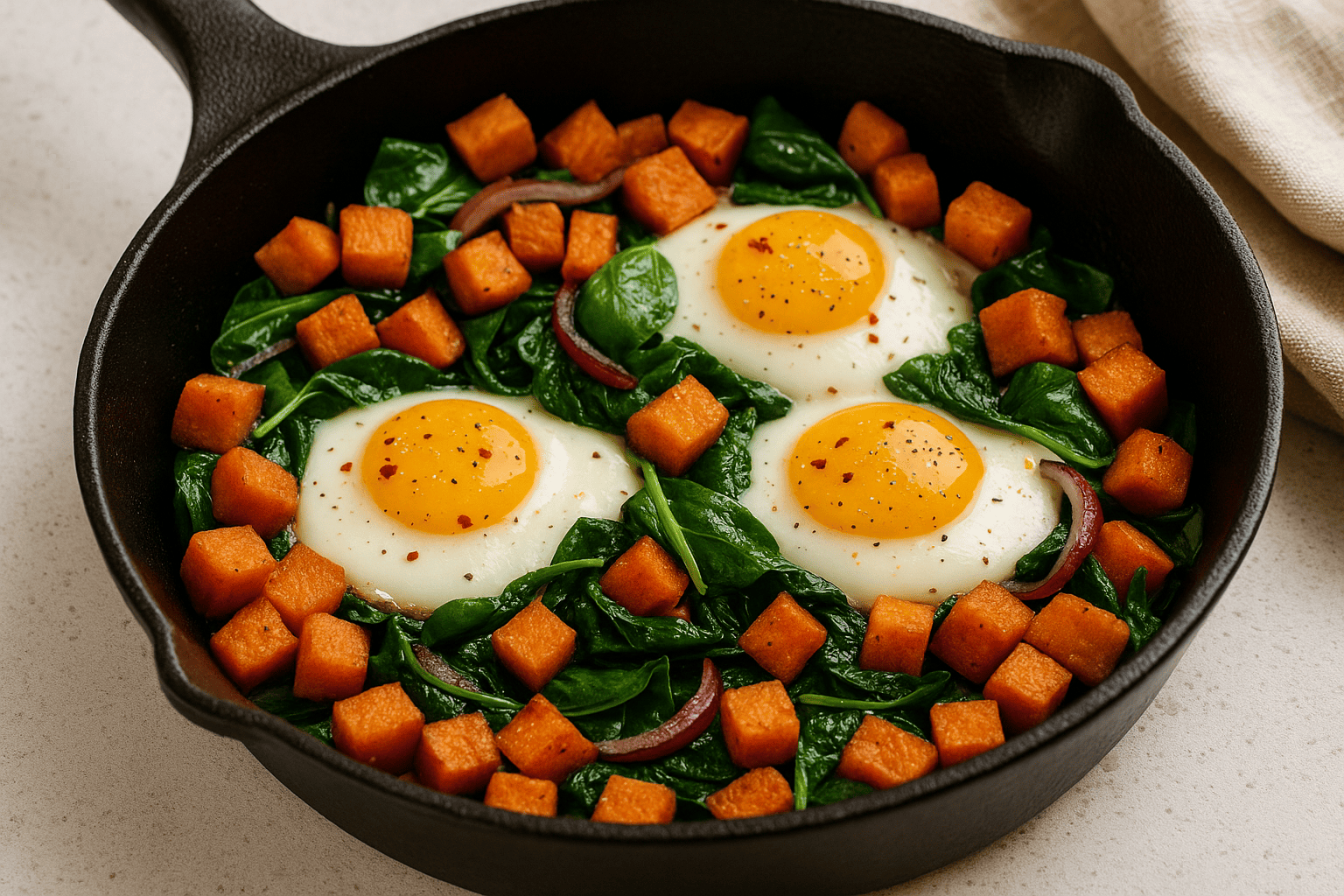 A colourful, hearty and healthy breakfast skillet made with crispy sweet potatoes, sautéed spinach and perfectly cooked eggs. This dish is naturally gluten-free, packed with nutrients, and ready in under 30 minutes.