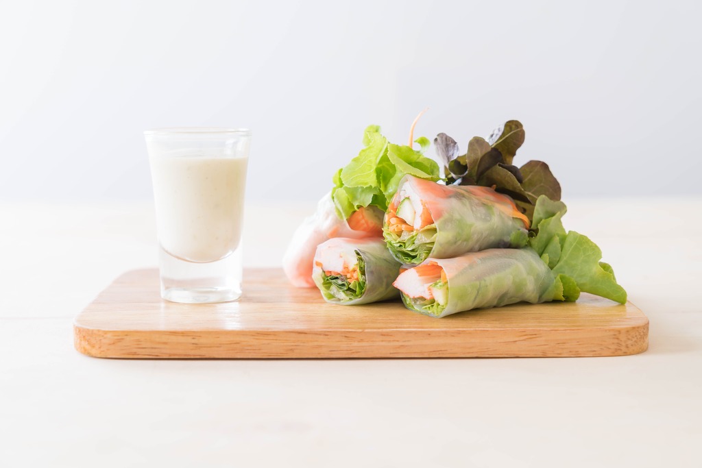 - Prepare all veggies and noodles. Set up a rolling station with a bowl of warm water, a clean surface, and all ingredients.